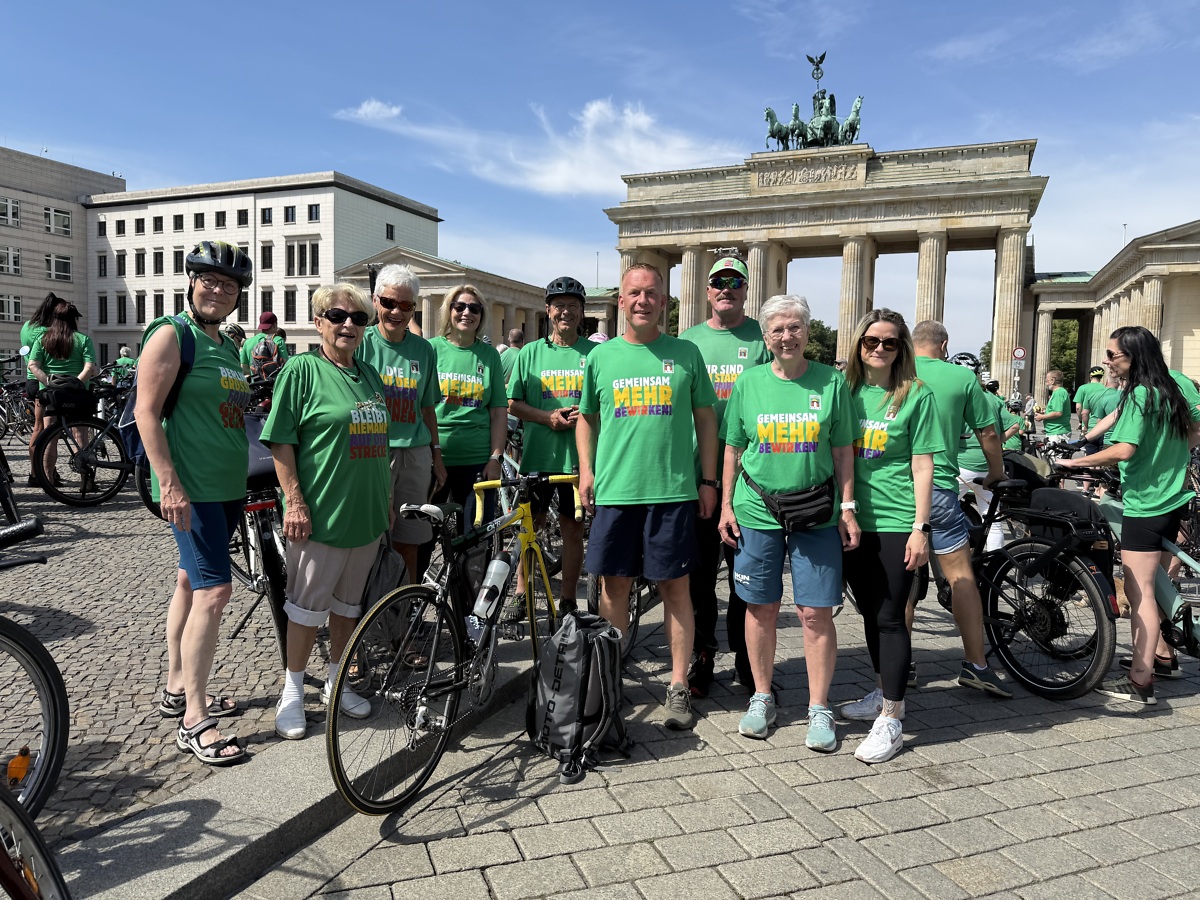 Genauso grün wie die Welle, mit der es dank der freundlichen Begleitung der Berliner Polizei durch die Stadt ging, waren natürlich auch wieder unsere Trikots. Deren einprägsame Sprüche sorgten zusammen mit unserem Bauklötzchen-Logo auf XL-Anhängern und Rucksack-Fahnen wieder für eine hohe Sichtbarkeit unserer Marke und unserer Botschaften. Applaus und Unterstützung gab es dafür von zahlreichen Menschen, die sich am Straßenrand versammelt hatten.